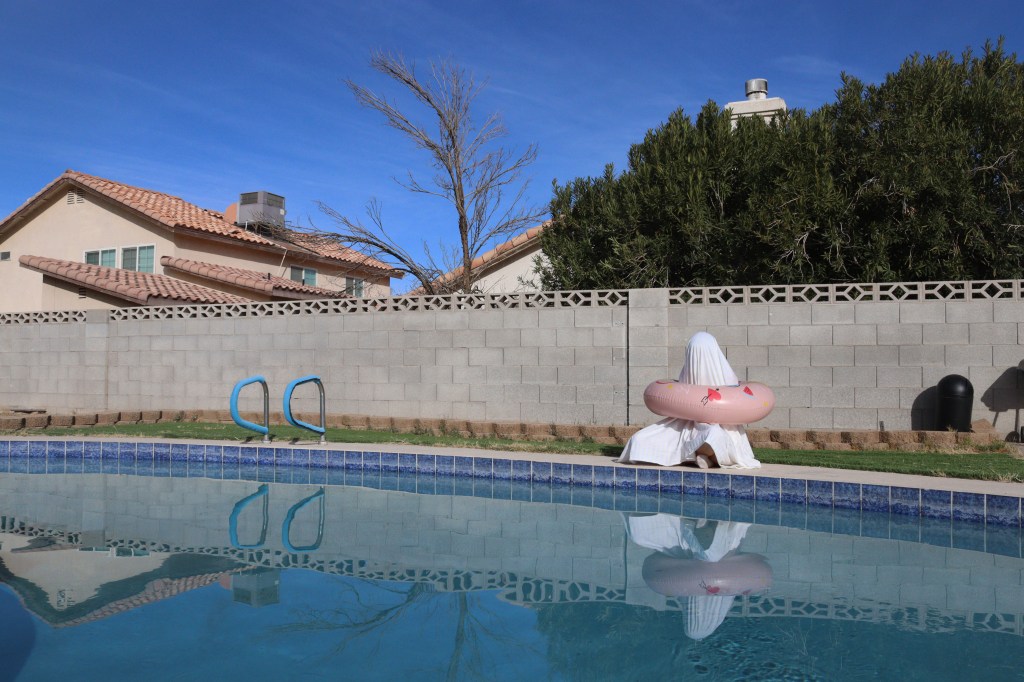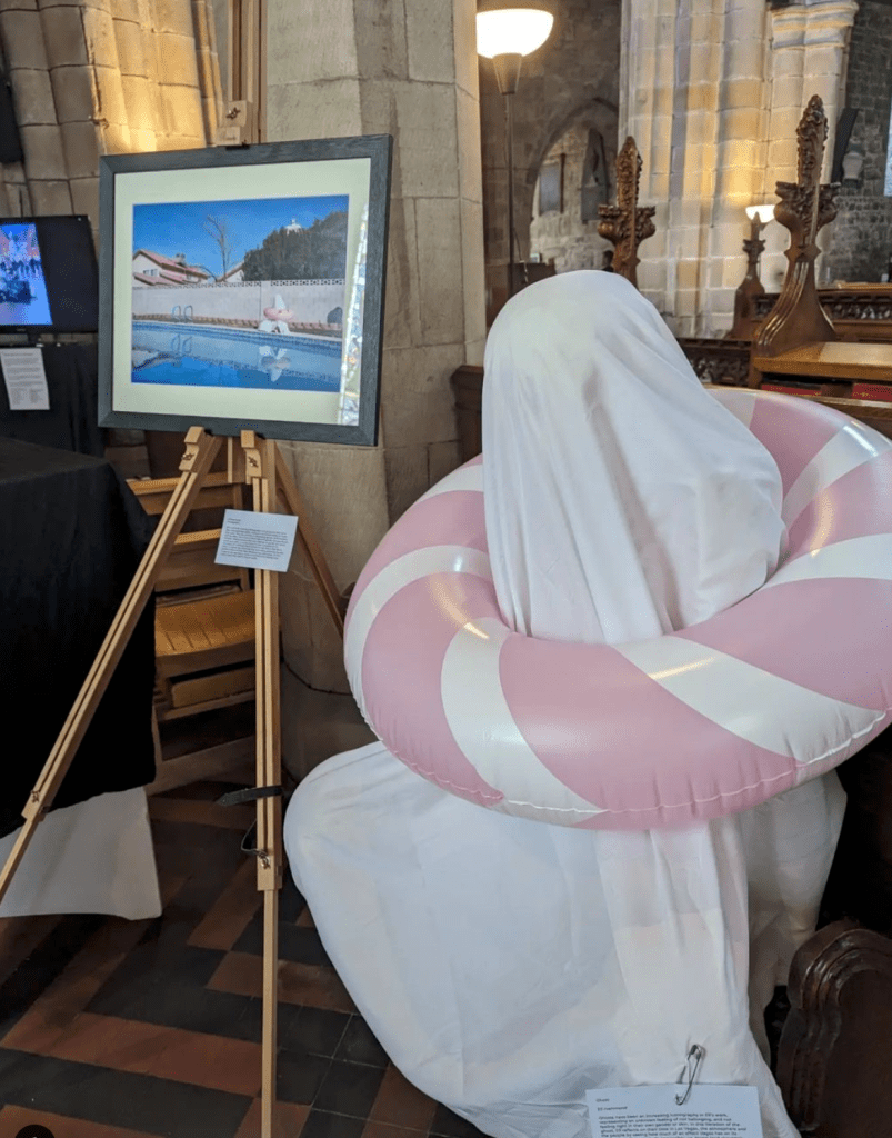 Ghosts have been an increasing iconography and interest in my work, representing an unknown feeling of not belonging, and not feeling right in my own gender and skin. In this iteration of the ghost, I reflect on my time in Las Vegas in January 2023, the atmosphere and the people, and saw how much of an effect Vegas has on its community. This city built, impossibly, on desert land shouldn’t exist, it should be a ghost town. Yet it isn’t, it’s bright, it’s vibrant, it’s bizarre and people live here. The ghost appears here representing the people and the gambling culture of Nevada, how the bright lights and inviting atmosphere has often made people ghosts of themselves, they’ve lost money, lost fame, lost family, and lost belongings in a city that was once theirs. It’s a dangerous side to Vegas.